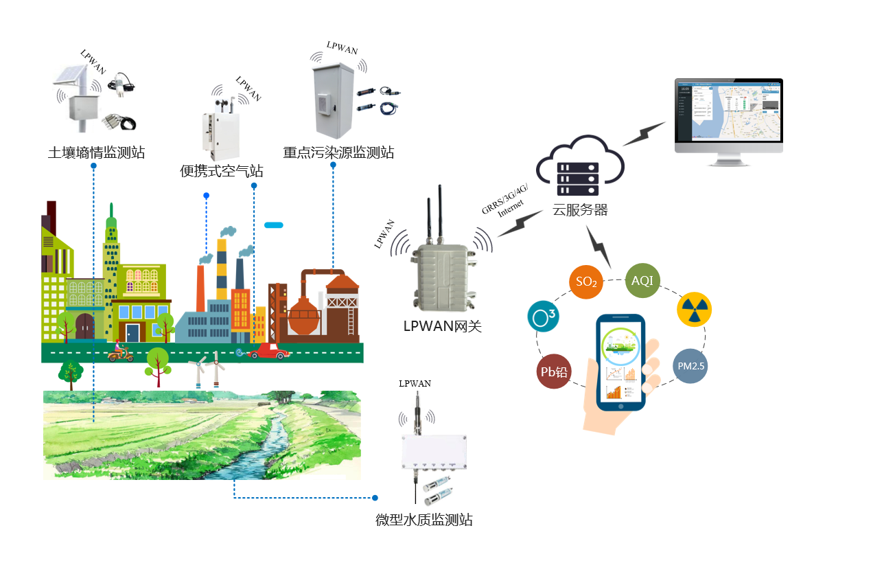 中物聯(lián)智能環(huán)保LPWAN網(wǎng)關最大接收靈敏度可達-157dBm,自適應鏈路速率,可移動式部署,射頻功耗50mW,遠低于一般電信運營商基站40W-60W的功率,支持3G/4G/LAN回傳接入,單網(wǎng)關可覆蓋周邊1-15KM范圍內(nèi)500個監(jiān)測站,云服務器可承載幾百個LPWAN網(wǎng)關的數(shù)據(jù)存儲,場景適用于小區(qū)、校園、公園、農(nóng)田、景區(qū)、黑臭河道、工業(yè)園等區(qū)域的環(huán)境監(jiān)控、改造和提升。